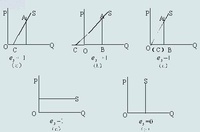 ①若供给曲线上任一点的切线在原点的右端交于横坐标,则在该点有es<1;②若供给曲线上任一点的切线在原点的左端交于横坐标,则在该点有es>1;③若供给曲线上任一点 切线过原点,则在该点有es=1。可见,在供给函数为非线性的情况下,曲线上各点的弹性是不同的。如果供给函数是线性的(只要供给曲线不是向右下倾斜),则供给线上各点的弹性是相同的,其几何意义非常直观。即只要线性的供给曲线在原点的右端交于横坐标,那么整条供给曲线上供给价格弹性都小于1;如果线性供给曲线在原点在端交于横坐标,那么整条曲线上供给价格弹性都大于1;若线性的供给曲线过原点,则整条供给曲线上供给价格弹性都等于1。