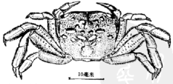 头胸甲呈近方形,甲长14毫米,宽15.5毫米。表面隆起,分区可辨,布有许多成簇的黑色短毛,排列成横行隆线。额宽,其宽度大于头胸甲宽的1/2,额前缘近于平直,饰以黑色短毛。眼窝小,背缘向后侧方倾斜。侧缘的前半部拱起,具短毛,除外眼窝角外,不明显的分为3叶,均宽而短,末叶最小,后半段较平直,表面较低洼。雄螯大于雌螯,掌节背面具l斜列梳状栉,可动指背面具有22个疣状粒。步足侧扁,密布黑色短毛,长节的长度约为其宽度的2.5倍,背面具数簇黑色短毛。雄性腹部呈宽三角形;雌性腹部圆大,尾节嵌入第6节内。