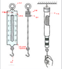 2.取一块310×80×5毫米的木板为底板,上端钉一块80×15×5毫米的小木板。在小木板的中心装一个羊眼圈为提环。把弹簧的一端焊接在提环上,另一端焊一根直径为2.5毫米、长为150毫米的铁丝。这段铁丝的下端有挂钩,上端与弹簧焊接处再装上一薄铁片作指针。指针应与铁丝垂直,在铁丝上的位置可调节。在底板上装一个弯成半圆形的小铁丝框,框住铁钩,以免铁钩左右摇摆。3.在底板上贴一张白纸条标定刻度。挂钩上不挂重物时指针所指的位置定为零刻度,然后依次在挂钩上挂上1.0牛、2.0牛、3.0牛、4.0牛、5.0牛等钩码,每挂上一个钩码,对准指针画上刻度,再把各刻度间的距离做适当的等分。(注:牛为单位,牛顿/N)