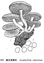 榆生离褶,Lyophyllum ulmarium (Bull. : Fr.) Fuhn 属于伞伞菌目、白蘑科、离褶伞属,子实体中等至较大,菌盖直径7-15cm,扁半球形,逐渐平展,光滑,中部浅赭石色,有时龟裂,边缘浅黄色。可食用,味道鲜美,质地好。