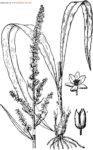 植株高达1米许,茎基部有数枚浅白色或棕褐色的膜质鞘;鞘枯死后,成为带网眼的纤维网或至少在鞘端如此。叶在下部的(近基生)带状、狭矩圆形、倒披针形或有时近狭镰刀状,长约30厘米或更长,宽1.5-2.5 (-8-8.5)厘米,先端锐尖,基部收窄为鞘,抱茎,两面无毛。圆锥花序具密集的花;侧生总状花序轴纤弱,通常着生雄性花,顶生总状花序生两性花;总轴和枝轴密生浅白色绵状毛,每一侧生花序基部有1枚长于或短于侧生花序的苞片;花被片淡黄绿色,近直立或平展,矩圆形或卵状矩圆形,通常长5-7毫米,宽3-4毫米,先端稍尖,基部收窄为短柄状,全缘,背面基部稍有毛,无明显可见的腺体;侧生花序上的花梗长(1-) 2-3(-4)毫米,小苞片近等长于或长于花梗,背面生绵状毛;子房近矩圆形,无毛。蒴果直立,紧密而伏贴于花序主轴。花果期7-10月。