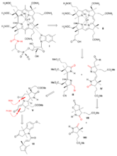 逆合成的第一步很简单。早在1960年,伯恩豪尔就提出尾状的长链可以用酰胺水解反应从维生素B 12中离去,得到 钴啉胺酸后可以再替换上其他基团。伍德沃德与艾申莫瑟尝试的是一项严格的中继合成,因为合成目标只是钴啉胺酸,并没有包括前人已经完成的尾状长链的连接。C5和C15上的甲基只有在咕啉环核心构建完成才能引入。该核心可由左侧的AD部分( III)和右侧的BC部分( IV)合成。由于空间位阻,两部分直接成环是不可行的,而在含硫试剂作用则可行。