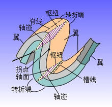 1. 核 指在平面或剖面上褶皱构造——背斜或向斜的中心部位。这是一个相对的概念,随着时间的变化核部地层或岩层的时代会有变化。2. 翼 泛指褶皱核部两侧的地层。4. 翼间角 指构成两翼的同一褶皱面的拐点的切线的夹角,亦指两翼 间的最小夹角。圆弧形褶皱的翼间角是指通过两翼上两个拐点的切线之间的夹角。5. 转折端 指褶皱面从一翼过渡到另一翼的弯曲部分。6.褶轴 对圆柱状褶皱而言,是指一条平行其自身移动能描绘出褶皱面弯曲形态的直线。7.枢纽 在褶皱的各个横剖面上,同一褶皱面的各最大弯曲点的联线。8.轴迹 轴面与地面或任一平面的交线。
