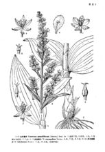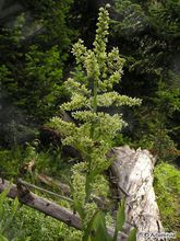 阿尔泰藜芦(Veratrum lobelianum Bernh.),植株高1米多,下部连叶鞘直径2-3厘米,基部具无网眼的纤维束。叶在茎下部的较大,宽卵状椭圆形,长约20厘米,宽10-16厘米,先端钝或渐尖,背面密生微柔毛,向上逐渐变小成披针形。