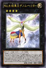 中文名:No.8 纹章王 基因组继承者日文名:No.8 纹章王ゲノム·ヘリター英文名:Number 8: Heraldic King Genom-Heritage卡片密码:47387961卡片种类:XYZ怪兽阶级:4属性:光种族:念动力攻击:2400防御:1800罕见度:金字UR,立体UTR,面闪SR卡包:ABYR(802)效果:XYZ:名字带有「纹章兽」的4星怪兽×2。1回合1次,选择对方场上1只XYZ怪兽才能发动。这张卡当作和选择的怪兽同名卡使用,得到相同的攻击力和效果。那之后,选择的怪兽的攻击力变成0,效果无效化。这张卡的效果直到结束阶段时适用。