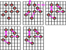 插入法(insertion) 先产生连接部分点的子路线,再根据某种法则将其它的点逐一加入路线。比如最近插入法(nearest insertion),先针对外围的点建构子路线,然后从剩余的点里面评估何者加入后路线总长度增加的幅度最小,再将这个点加入路线。又比如最远插入法(farthest,insertion),是从剩余的点里面选择距离子路线最远的点,有点先苦后甜的滋味。模拟退火算法